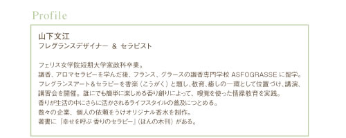 私が香り創りと出会ったのは今から数十年前でした。自律神経失調症となって体を壊し、死の一歩手前までの経験をした後生きる気力をなくしていた私に、「 まだ大丈夫、まだ頑張れる」と気付かせてくれたのが香りでした。 心の中から泉のように湧き出してくる美しい景色、その景色や色から優しい気持ちになれたり嬉しくなったりと、 夢をみると言うことなど程遠くなっていた私に、 毎日わくわくしていた幼い頃のエネルギーがまだ残っていることを実感させてくれました。 香りが私に教えてくれた素晴らしい世界は今まである香りの世界の、どのジャンルにも属さないことに気がつきました。 香りを観ることをフレグランススケッチ、処方を作っていくことをフレグランスデザイン、 香りが見せてくれた世界を絵や文字で表現することをフレグランスデッサン、 そして香り創り全体をフレグランスアートと名づけ、その過程、 そして出来上がった香りから癒される世界をフレグランスセラピーと名づけました。 そして香り創りに必要な道具を香の具と名づけました。 人間の五感が与えられ、その感性から生きる喜びやエネルギーを培っていくために香りを使った嗅覚教育を香学として広げていけたら、 私が今生かされていることへの恩返しが出来るように思っています。 素晴らしい香りの世界へようこそ! |